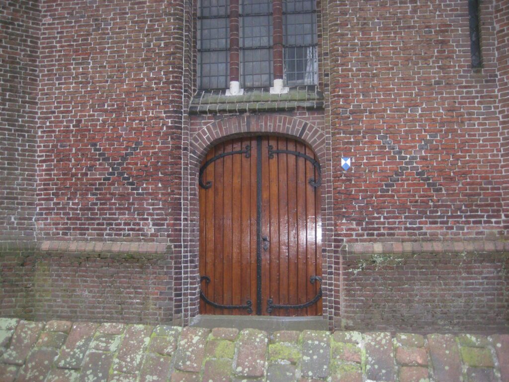 Als je toch bij de kerk bent, kijk dan ook even naar die fraaie zwarte metselkruisen naast de grote torendeur. Dat zijn een soort versierselen waarbij de zwarte stenen die (te) dicht bij de vuurmond waren gebakken, gebruikt als een soort versiering. Er zijn mensen die denken dat het juridische of symbolen van het recht zijn, maar ook dat zijn charlatans, denk ik, mensen met iets teveel fantasie……