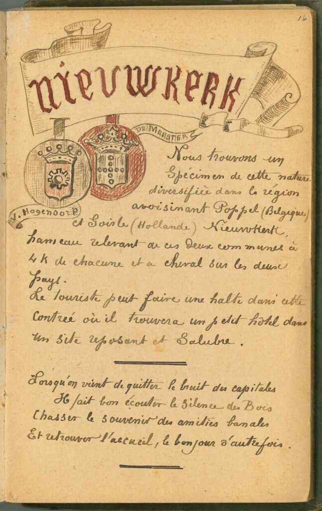 Onder deze titel schreef Albert de Meester de Betzenbroeck rond 1918 een boekje over Nieuwkerk en de directe omgeving. En dan wordt met “geschreven” ook echt “geschreven” bedoeld: hij deed het met de vulpen. In diezelfde tijd voegde hij er nog een tweede boekje aan toe met grotendeels dezelfde inhoud onder de titel “Quelques notes sur Nieuwkerk et environs”.