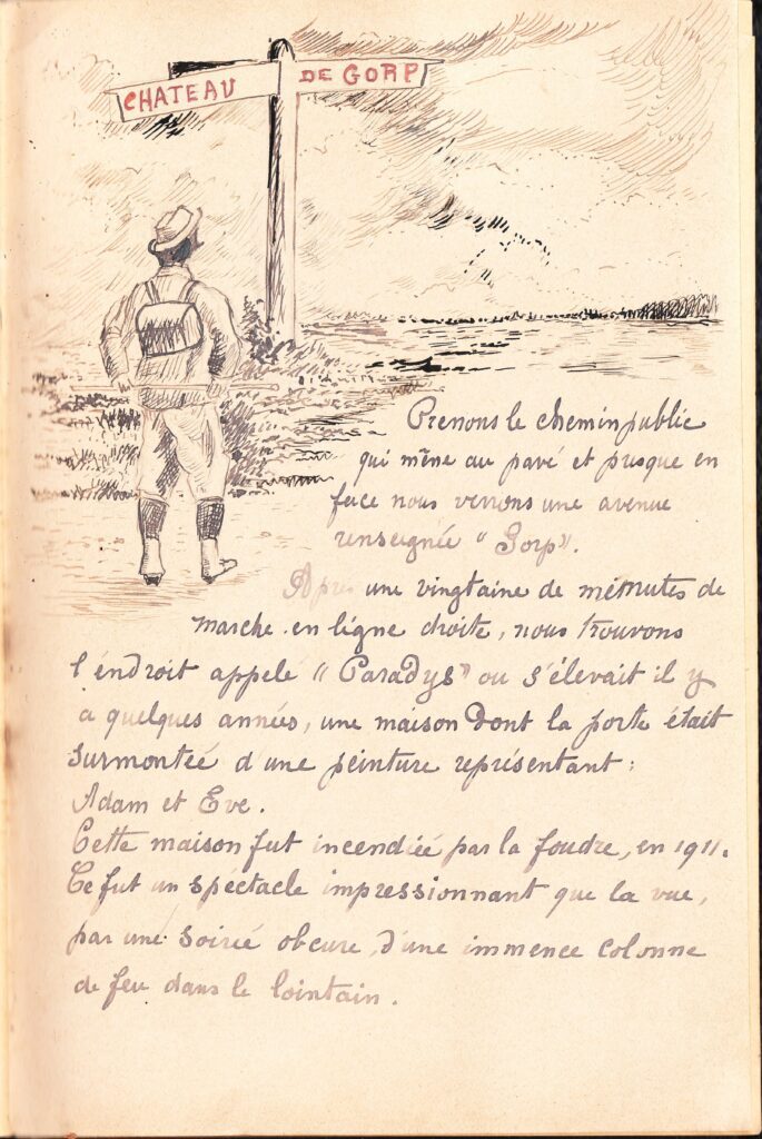 Zo schrijft hij op een gegeven moment: “Nemen we de weg naar het klooster van de paters van de H. Familie en lopen een kwartier rechtdoor, laten de weg naar Aerle links liggen evenals de werkmanshuizen dan zien we even verder een prachtig uitzicht: in de verte achter ons Tilburg met zijn fabrieken, de bossen van Gorp, de toren van Hilvarenbeek, Goirle en zijn hoge schoorstenen, voor ons de kerk van Alphen, links die van Baarle-Nassau en Baarle-Hertog en Chaam iets naar rechts, Gilze en Riel en voor ons de sparrenbossen; een oase in de wildernis.”