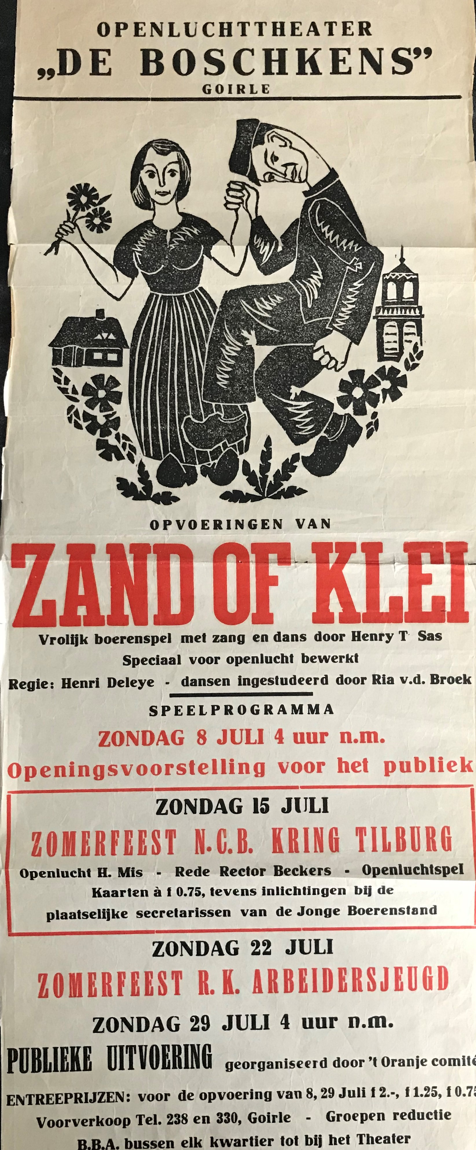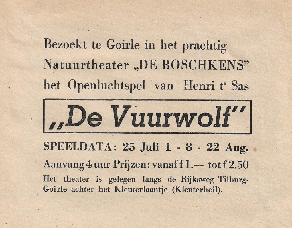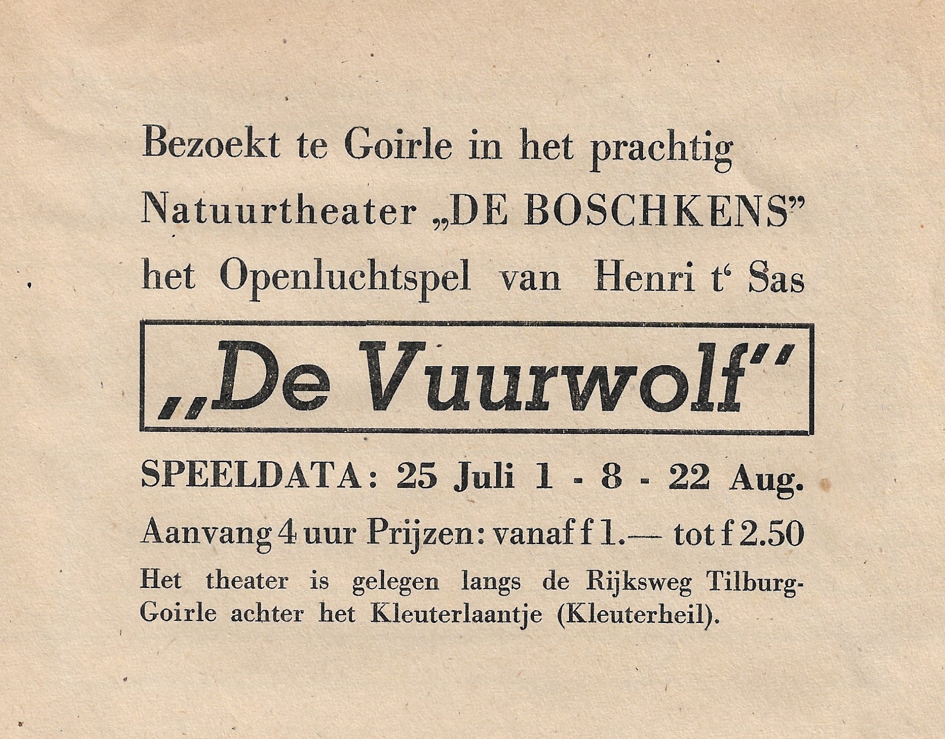 Het zijn zo’n beetje de culturele parels van Brabant, dat kleine aantal openluchttheaters in onze provincie. Ik denk dan aan Oisterwijk met zijn Natuurtheater (al vanaf 1915!), en de Kersouwe in Heeswijk-Dinther, en in Oosterhout bij de Kapucijnen in 1957… Ook Goirle stond ooit in dat rijtje met Openluchttheater De Boschkens….