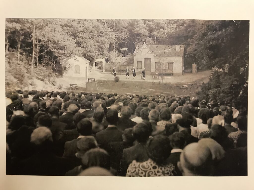 Het moet spannend zijn geweest in juli 1948 of het Openluchttheater op tijd klaar zou zijn. En dat lukte! Het was klaar op 4 juli 1948 voor de première met het toneelstuk “De Vuurwolf”. Maarr… toen was het 4 juli 2 uur ‘s middags en toen plensde het net in het begin van het stuk een half uur lang met pijpenstelen! Iedereen was ineens drijfnat en de sfeer sloeg ineens om…. De spelers speelden door, maar de lol was er meteen af…. De spelers kregen achteraf wel veel pluimen, zeker de hoofdrolspelers Harrie van Erven als Nathan de woekeraar, Piet van den Hout als de vuurwolf en zijn tegenspeelster Dyn van Erven. Zeven keer hebben ze gespeeld in juli en augustus 1948. In 1949 speelden ze weer, met beter weer, dat wel. Het stuk heette In ’t Ooievaarsnest, ook een stuk van de Bredase schrijver Henri t’ Sas..