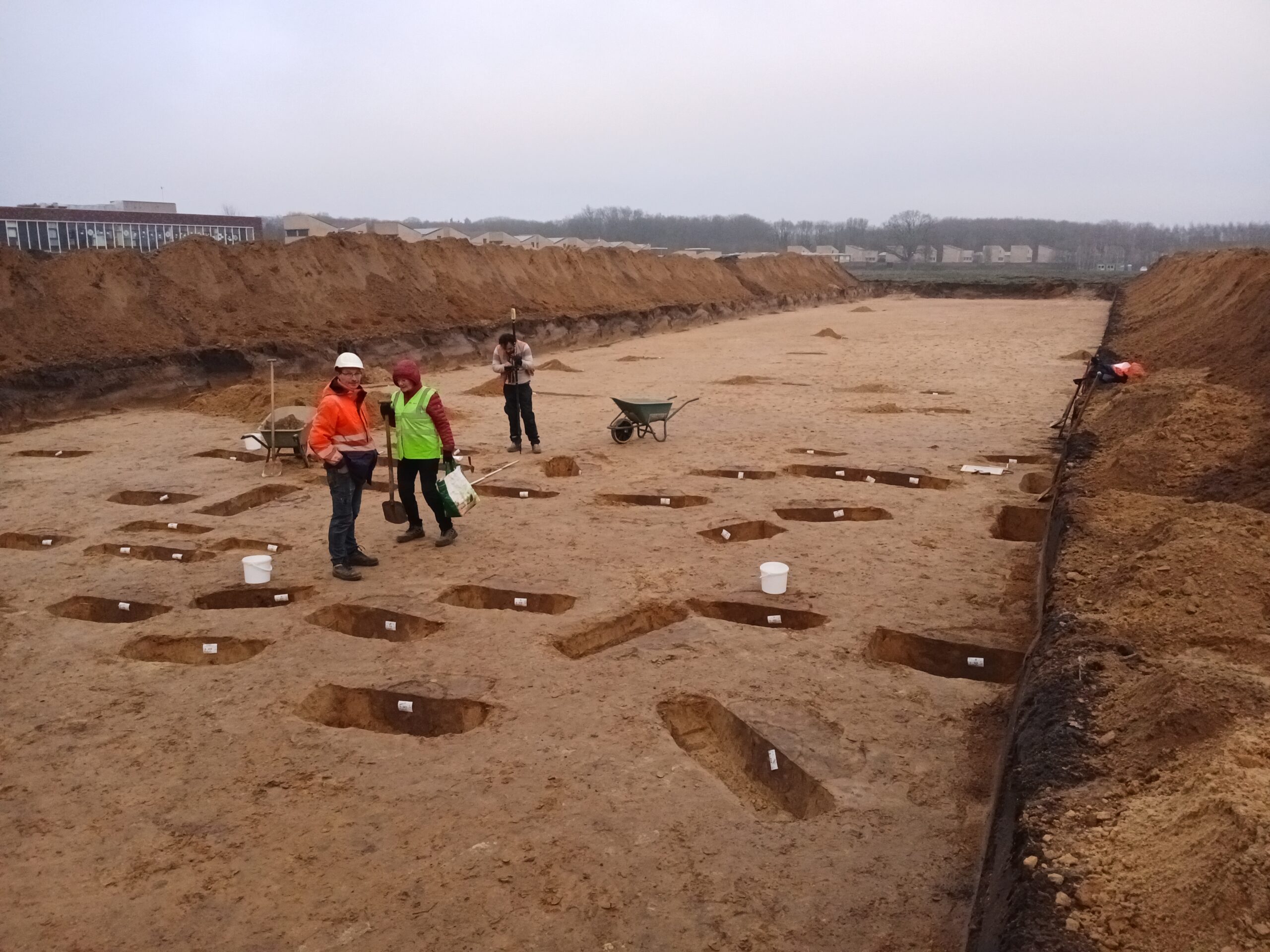 Vanaf maandag 26 januari tot en met 17 april ’26 zal RAAP opgravingen uitvoeren in het plangebied Bakertand te Goirle. Projectleider is Martijn Bink van het archeologische opgravings- en onderzoekbureau RAAP. Ze zullen ca. 3 ha opgraven van vindplaatsen uit de midden-bronstijd, late bronstijd/ijzertijd, vroege middeleeuwen en late middeleeuwen/nieuwe tijd. In de herfst is door middel van proefsleuvenonderzoek gepeild of er mogelijk archeologische vindplaasten op deze locatie te verwachten zijn. Op grond van dit vooronderzoek worden bepaalde plaatsen tot en met 17 april nader onderzocht, omdat daar naar verwachting meer te vinden is. Op de foto is te zien dat eind januari al meerdere zgn. paalgaten van een woonhuis/boerderij zijn blootgelegd. De paalgaten zijn in de grond te herkennen als donkere verkleuringen in het gele zand. Verschillende heemleden helpen bij de opgraving.