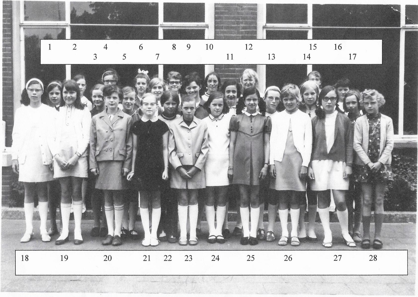 De Tarcisiusschool die ooit op het Oranjeplein stond kreeg in de 60-er jaren een nieuw gebouw aan de Korte Vorenstraat. Het gebouw waar de jongens uit vertrokken kreeg een nieuwe bestemming als meisjesschool aan de oostelijke kant van de Tilburgseweg omdat er aan die kant nog geen was. De school kreeg de naam Agnesschool. Na enkele jaren zou ook deze school gemengd worden en tot aan de sluiting in 1988 blijven. Nog voor de toelating van jongens zaten er dus gedurende enkele alleen meisjes op deze school. Zo ook de klas die hier afgebeeld is. Als we de foto goed bekijken denken we dat het gaat om de zesde klas die mogelijk zo in het goede goed gestoken waren dat we aan de plechtige communie denken. Het belangrijkste is echter dat we deze foto vonden als een kopie met de nummering erbij: we hebben de foto dus niet zonder nummering erop. Twee meisjes werden door een van onze medewerkers herkend: een meisje van de familie Otten en een van de familie van Gestel, ze zijn te vinden onder nummer 3 en 21.