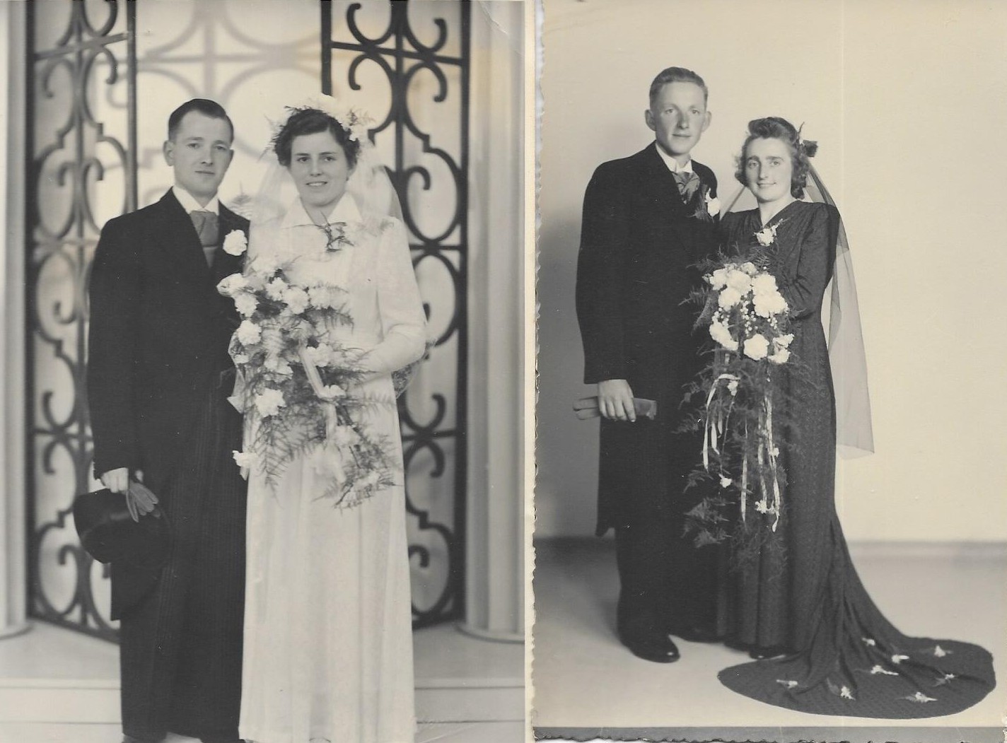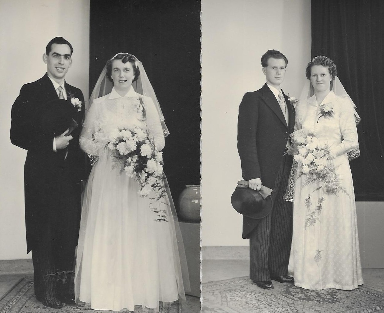 De mensen op deze foto’s laten heel mooi zien wat de bruidsmode in die tijd was: echt niet altijd puur wit. De uitstraling lijkt voor sommigen mogelijk gedateerd maar in die tijd was het hoog mode. De sluier en de lange jurk, hooguit een korte sleep. En vergeet de heren bruidegoms niet: standaarduitrusting bevatte ook de hoge zijen, de hoge hoed: een tamelijk hard geval dat niet altijd even goed paste maar wat er doodgewoon bij hoorde in combinatie met de slipjas (of oneerbiedig de billentikker) en -kijk maar goed- een paar handschoenen. Op die dag mocht het best een beetje chique zijn. In de studio bij de fotograaf werden de officiële bruidsfoto’s gemaakt, vaak staand met of zonder bruidsmeisjes, vaak ook nog alleen de gezichten.